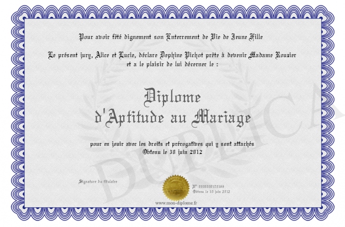 Envoyez par email votre Diplôme d'Aptitude au Mariage personalisé