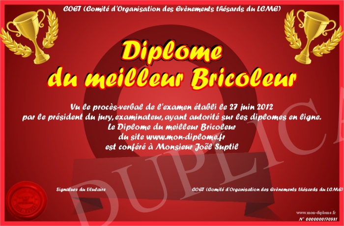 Envoyez par email votre Diplome du meilleur Bricoleur personalisé