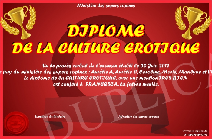 Envoyez par email votre DIPLOME DE LA CULTURE EROTIQUE personalisé