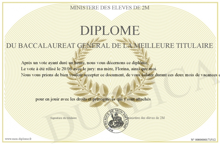 Envoyez par email votre Diplôme du baccalaureat général de la meilleure titulaire personalisé