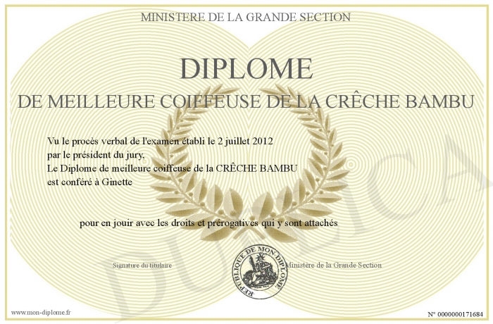 Envoyez par email votre Diplôme de meilleure coiffeuse de la CRÊCHE BAMBU personalisé