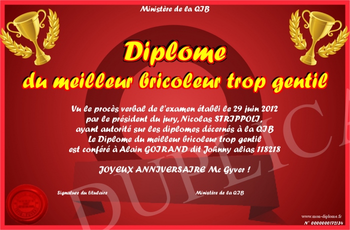 Envoyez par email votre Diplôme du meilleur bricoleur trop gentil personalisé