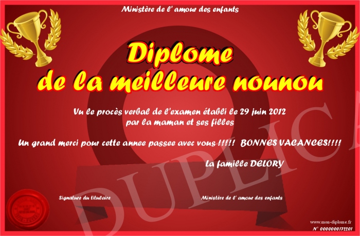 Envoyez par email votre Diplôme de la meilleure nounou personalisé