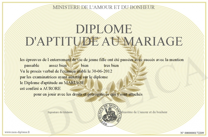 Envoyez par email votre Diplôme d'aptitude au MARIAGE personalisé