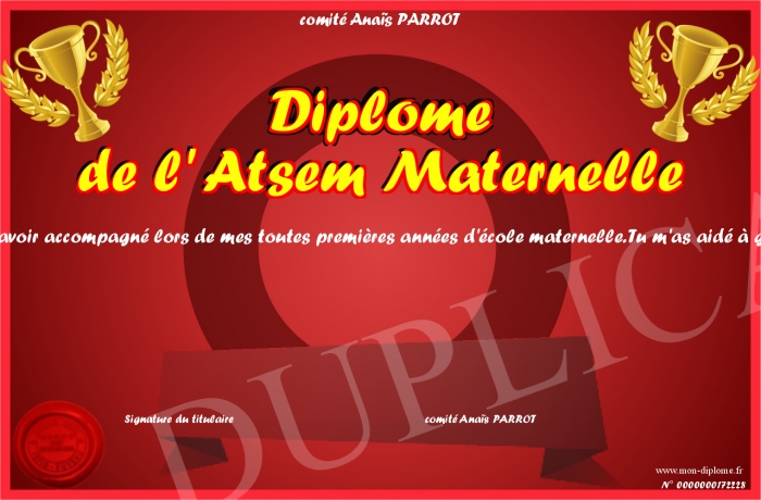 Envoyez par email votre Diplôme de l' Atsem Maternelle personalisé