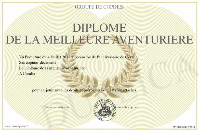 Envoyez par email votre Diplôme de la meilleure aventurière personalisé
