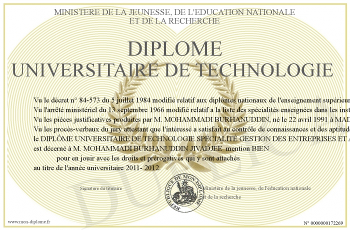 Envoyez par email votre Diplôme UNIVERSITAIRE DE TECHNOLOGIE personalisé