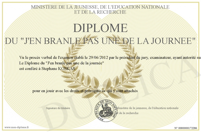Envoyez par email votre Diplôme du -J'en branle pas une de la journée- personalisé