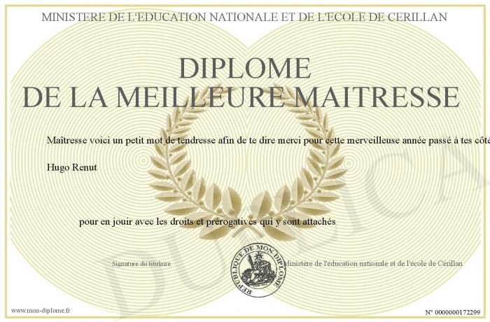 Envoyez par email votre Diplôme de la meilleure maItresse personalisé
