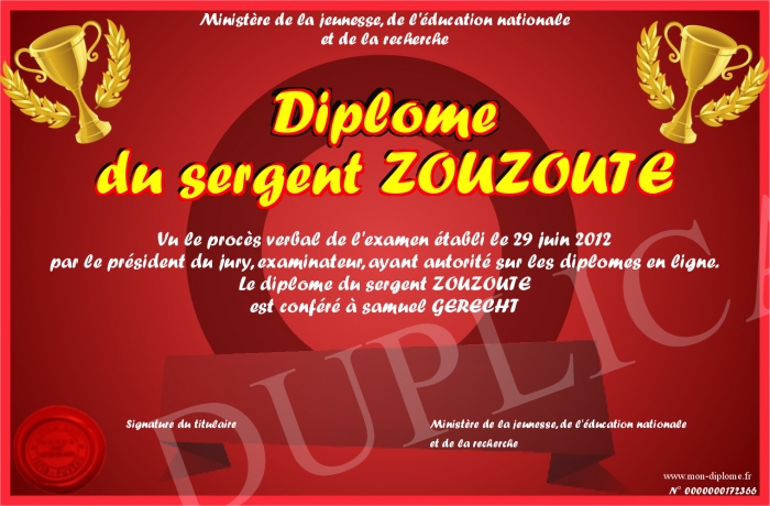 Envoyez par email votre Diplôme du sergent ZOUZOUTE personalisé