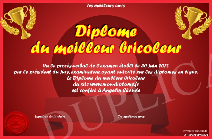 Envoyez par email votre Diplôme du meilleur bricoleur personalisé