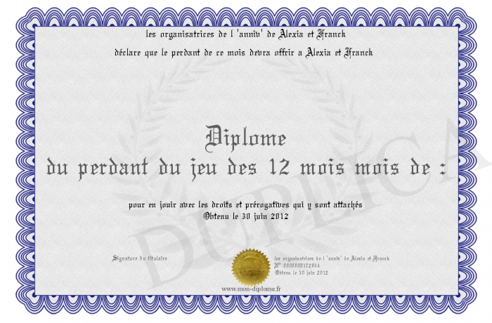 Envoyez par email votre Diplôme du perdant du jeu des 12 mois mois de : personalisé