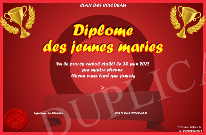 Envoyez par email votre Diplôme des jeunes maries personalisé