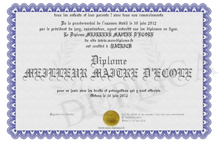 Envoyez par email votre Diplôme MEILLEUR MAITRE D'ECOLE personalisé