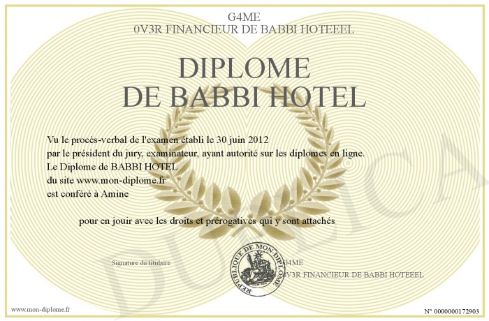 Envoyez par email votre Diplôme de BABBI HOTEL personalisé