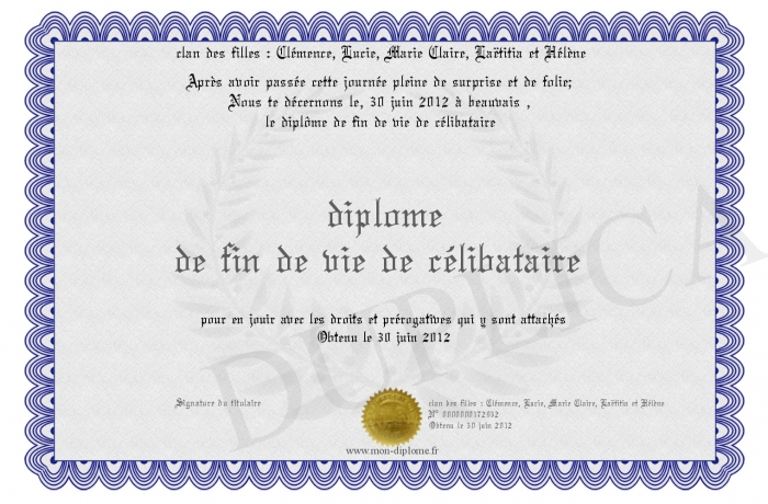 Envoyez par email votre diplôme de fin de vie de célibataire personalisé