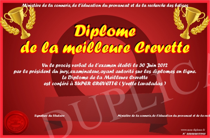 Envoyez par email votre Diplôme de la meilleure Crevette personalisé