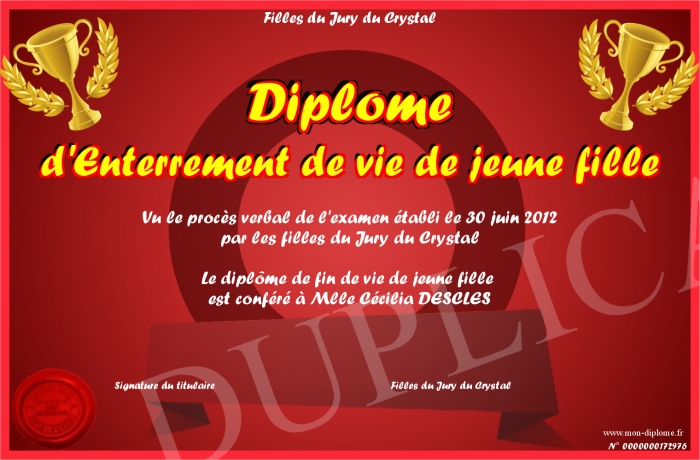 Envoyez par email votre Diplome d'Enterrement de vie de jeune fille personalisé