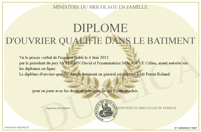 Envoyez par email votre Diplôme d'ouvrier qualifié dans le batiment personalisé