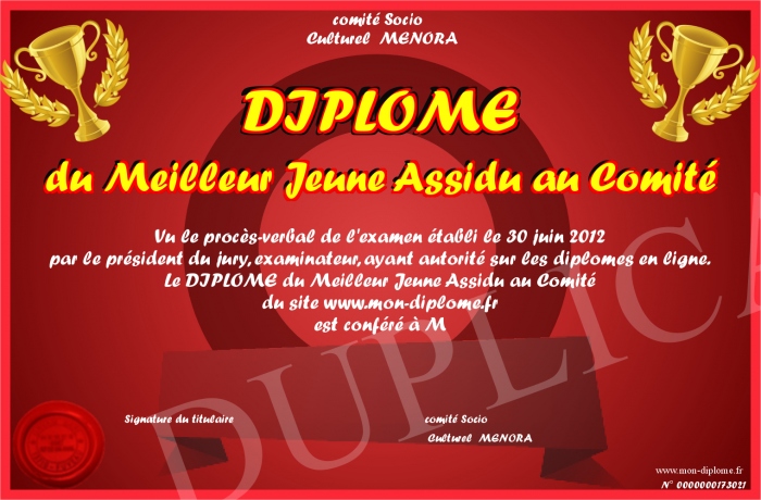 Envoyez par email votre DIPLOME du Meilleur Jeune Assidu au Comité personalisé