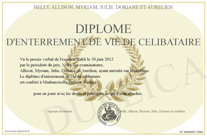 Envoyez par email votre Diplôme d'enterrement de vie de célibataire personalisé