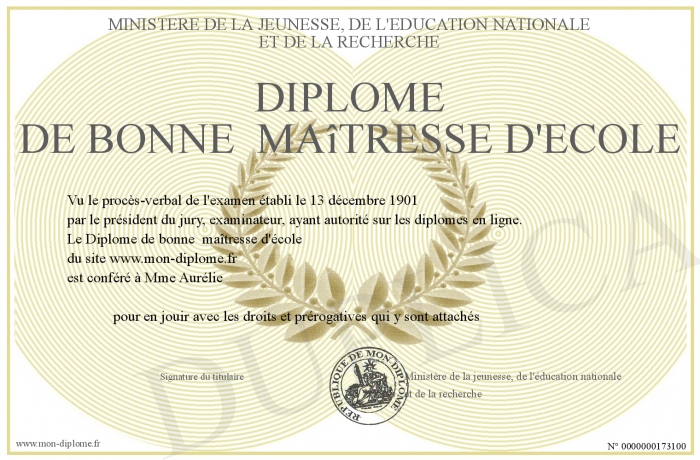 Envoyez par email votre Diplôme de bonne maîtresse d'école personalisé
