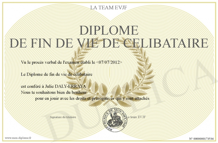 Envoyez par email votre Diplôme de fin de vie de célibataire personalisé