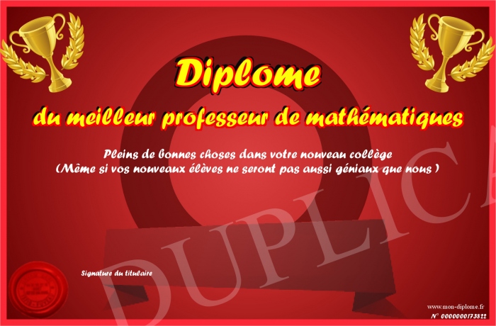 Envoyez par email votre Diplôme du meilleur professeur de mathématiques personalisé