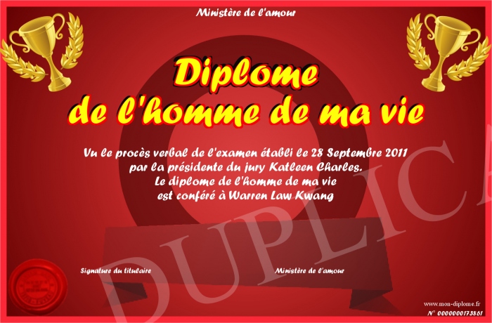Envoyez par email votre Diplôme de l'homme de ma vie personalisé