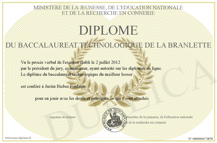 Envoyez par email votre Diplôme du baccalaureat technologique de la branlette personalisé