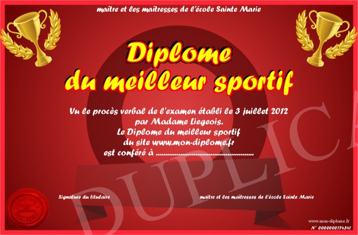 Envoyez par email votre Diplôme du meilleur sportif personalisé