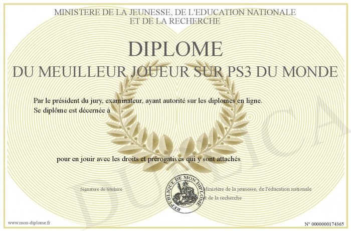 Envoyez par email votre Diplôme du meuilleur joueur sur PS3 du monde personalisé