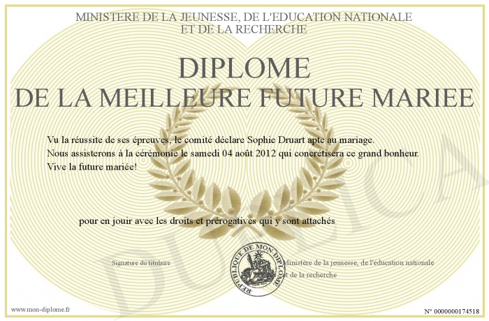 Envoyez par email votre Diplôme de la meilleure future mariée personalisé