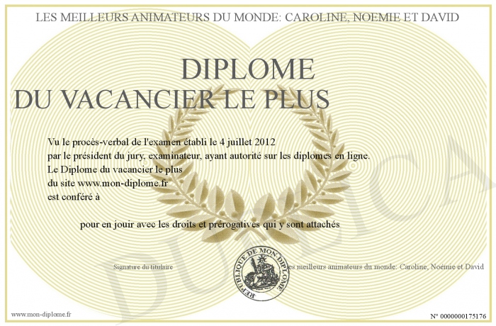 Envoyez par email votre Diplôme du vacancier le plus personalisé