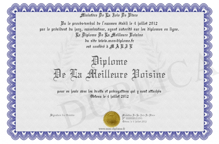 Envoyez par email votre Diplome De La Meilleure Voisine personalisé
