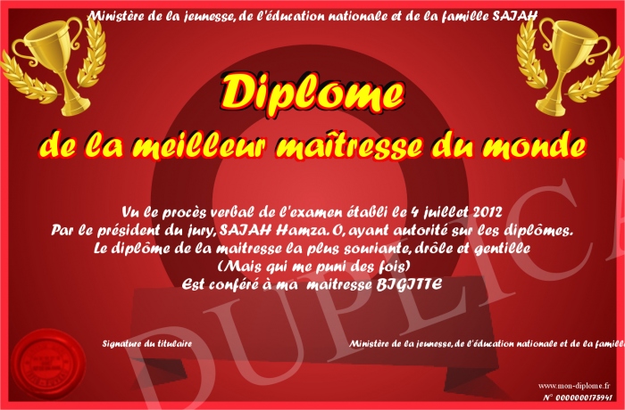 Envoyez par email votre Diplôme de la meilleur maîtresse du monde personalisé
