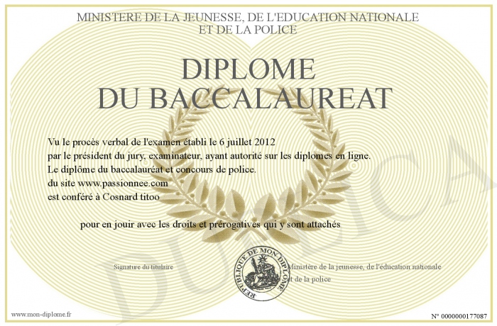 Envoyez par email votre Diplôme du baccalaureat personalisé