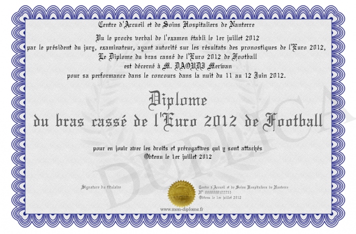 Envoyez par email votre Diplôme du bras cassé de l'Euro 2012 de Football personalisé