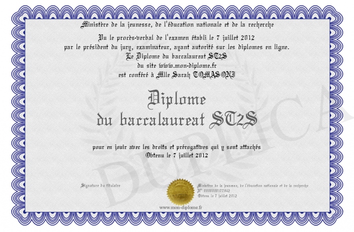 Envoyez par email votre Diplôme du baccalaureat ST2S personalisé
