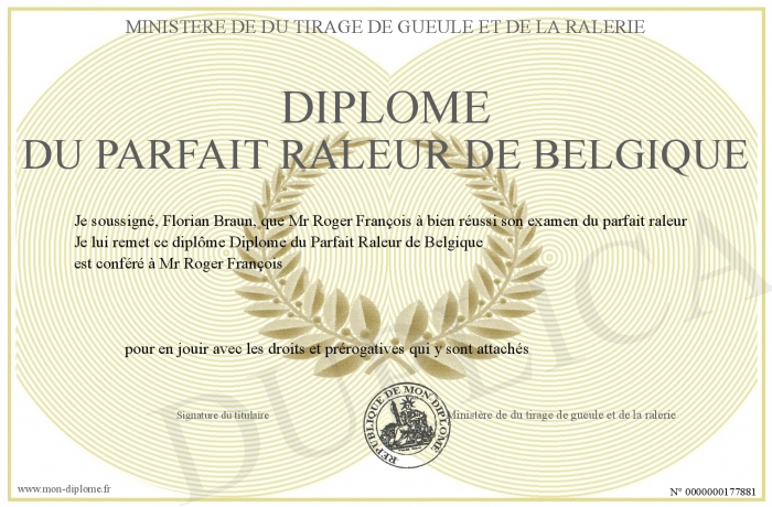 Envoyez par email votre Diplôme du Parfait Raleur de Belgique personalisé