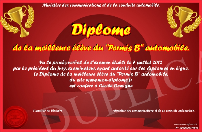 Envoyez par email votre Diplôme de la meilleure élève du -Permis B- automobile. personalisé