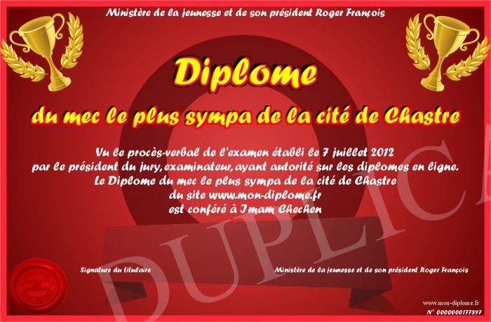 Envoyez par email votre Diplôme du mec le plus sympa de la cité de Chastre personalisé
