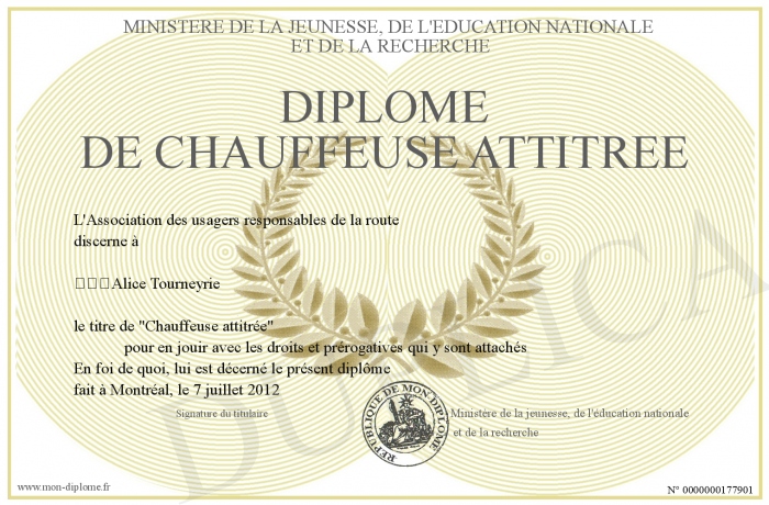 Envoyez par email votre Diplôme de chauffeuse attitrée personalisé