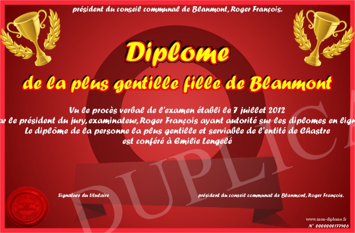 Envoyez par email votre Diplôme de la plus gentille fille de Blanmont personalisé
