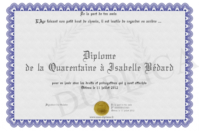 Envoyez par email votre Diplome de la Quarentaine à Isabelle Bédard personalisé