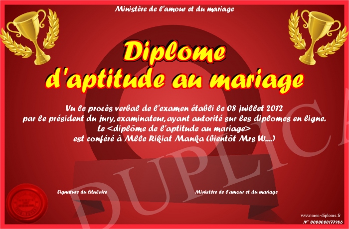 Envoyez par email votre Diplome d'aptitude au mariage personalisé