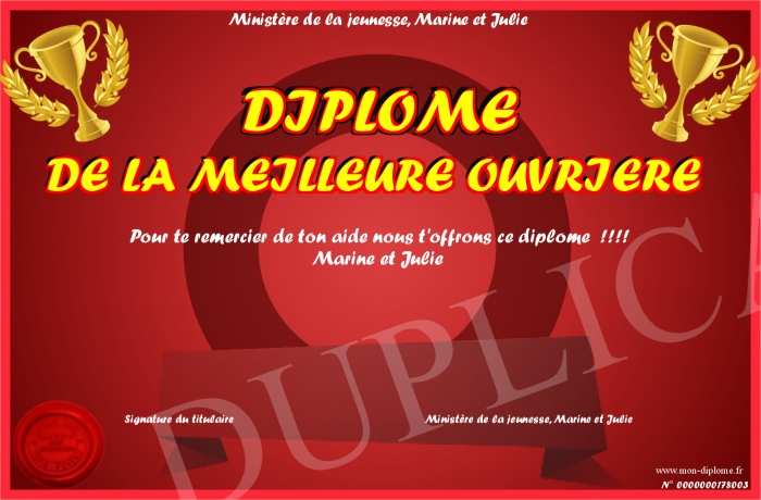 Envoyez par email votre DIPLOME DE LA MEILLEURE OUVRIERE personalisé