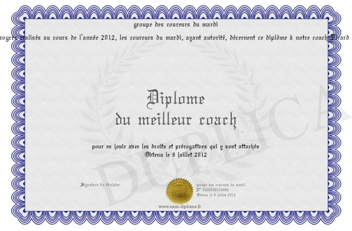 Envoyez par email votre Diplôme du meilleur coach personalisé