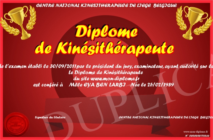 Envoyez par email votre Diplôme de Kinésithérapeute personalisé