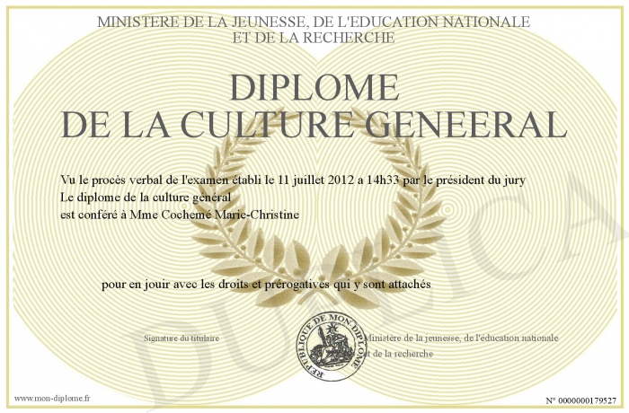 Envoyez par email votre Diplôme de la culture géneéral personalisé